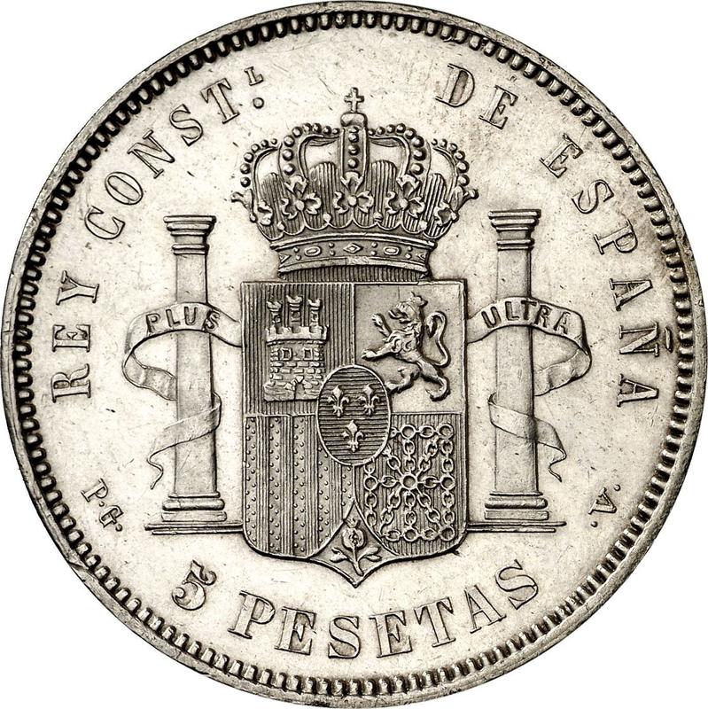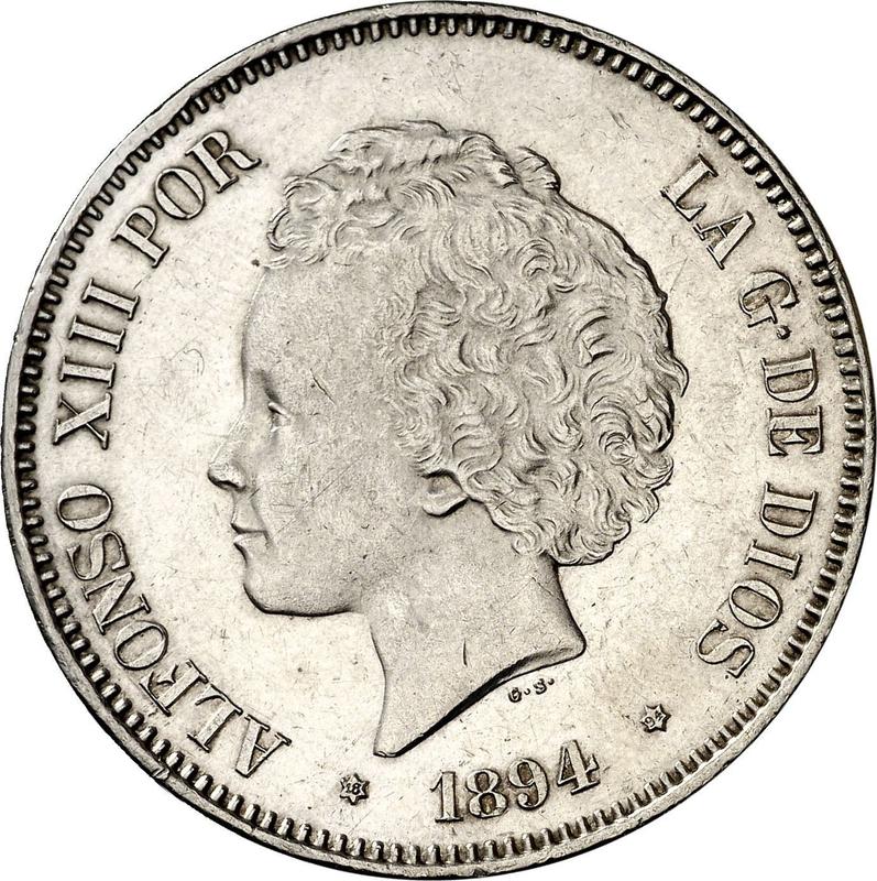 Find out the current coin value of the Spanish 5 Pesetas 1894 with mark PGV. This silver coin from the times of Alfonso XIII struck at the Madrid Mint. Wondering how much a coin like this is worth? The record price belongs to the lot 1401 sold at the Classical Numismatic Group, LLC auction for USD 1,300. Bidding took place January 7, 2014.
