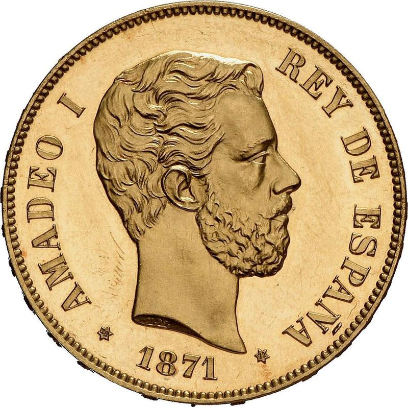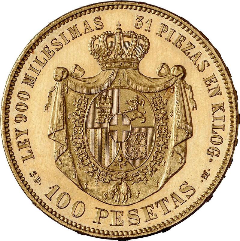 Find out the current coin value of the Spanish 100 Pesetas 1871 with mark SDM. This gold coin from the times of Amadeo I struck at the Madrid Mint. Wondering how much a coin like this is worth? The record price belongs to the lot 39 sold at the Aureo & Calicó, S.L. auction for EUR 300,000. Bidding took place December 16, 2021.