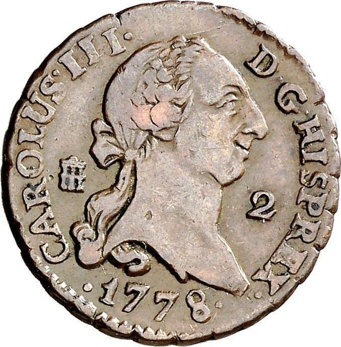 Find out the current coin value of the Spanish 2 Maravedís 1778 . This copper coin from the times of Charles III struck at the Segovia Mint. Wondering how much a coin like this is worth? The record price belongs to the lot 562 sold at the Jesús Vico auction for EUR 150. Bidding took place December 14, 2021.