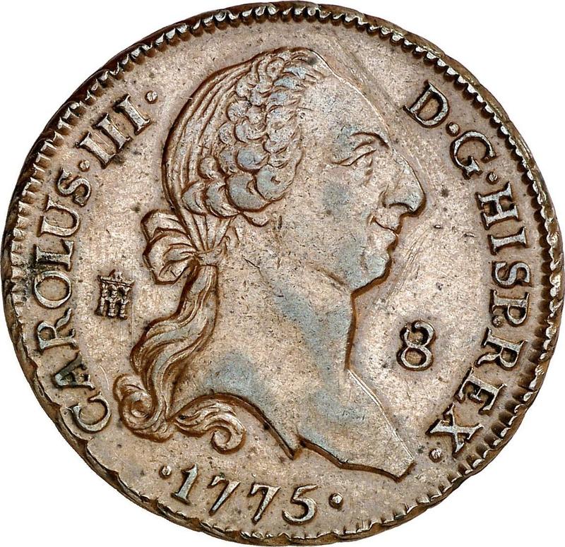 Find out the current coin value of the Spanish 8 Maravedís 1775 . This copper coin from the times of Charles III struck at the Segovia Mint. Wondering how much a coin like this is worth? The record price belongs to the lot 21250 sold at the Cayón Subastas auction for EUR 1,000. Bidding took place January 29, 2021.
