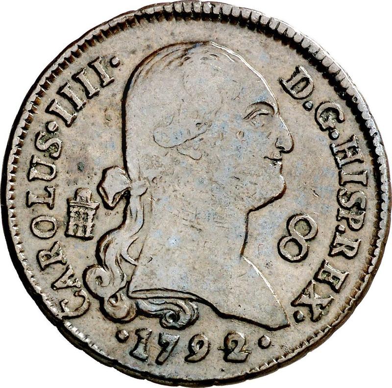 Find out the current coin value of the Spanish 8 Maravedís 1792 . This copper coin from the times of Charles IV struck at the Segovia Mint. Wondering how much a coin like this is worth? The record price belongs to the lot 32 sold at the Aureo & Calicó, S.L. auction for EUR 160. Bidding took place October 29, 2015.