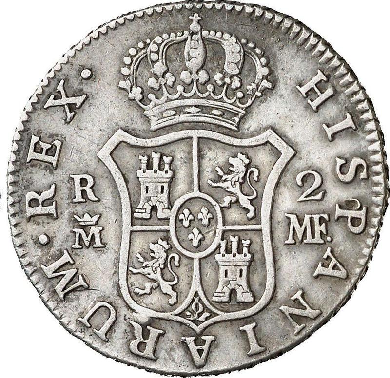 Find out the current coin value of the Spanish 2 Reales 1788 with mark M MF. This silver coin from the times of Charles IV struck at the Madrid Mint. Wondering how much a coin like this is worth? The record price belongs to the lot 5111 sold at the Cayón Subastas auction for EUR 115. Bidding took place September 28, 2022.