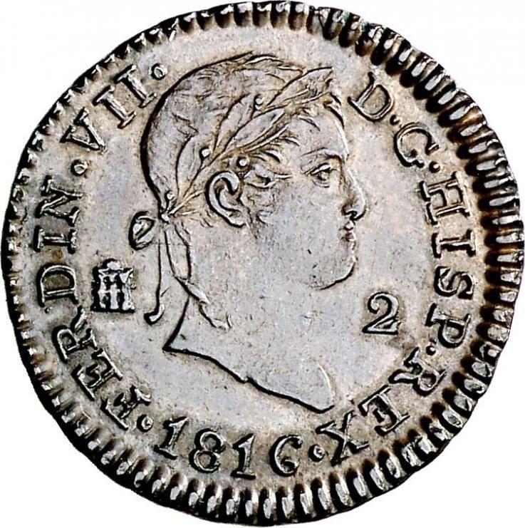 Find out the current coin value of the Spanish 2 Maravedís 1816 . This copper coin from the times of Ferdinand VII struck at the Segovia Mint. Wondering how much a coin like this is worth? The record price belongs to the lot 124 sold at the Aureo & Calicó, S.L. auction for EUR 170. Bidding took place April 23, 2015.