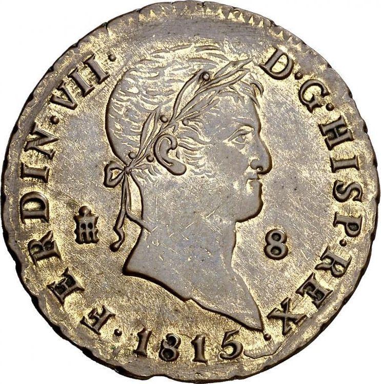 Find out the current coin value of the Spanish 8 Maravedís 1815 . This copper coin from the times of Ferdinand VII struck at the Segovia Mint. Wondering how much a coin like this is worth? The record price belongs to the lot 936 sold at the Jesús Vico auction for EUR 520. Bidding took place November 7, 2013.