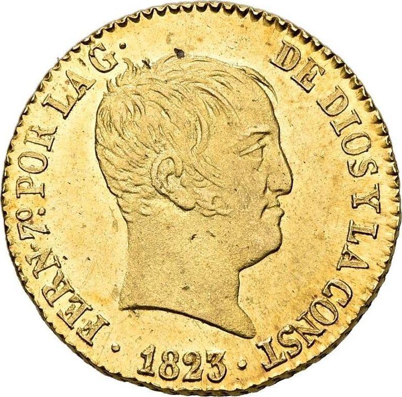 Find out the current coin value of the Spanish 80 Reales 1823 with mark B SP. This gold coin from the times of Ferdinand VII struck at the Barcelona Mint. Wondering how much a coin like this is worth? The record price belongs to the lot 425 sold at the MDC Monaco auction for EUR 2,200. Bidding took place October 1, 2025.