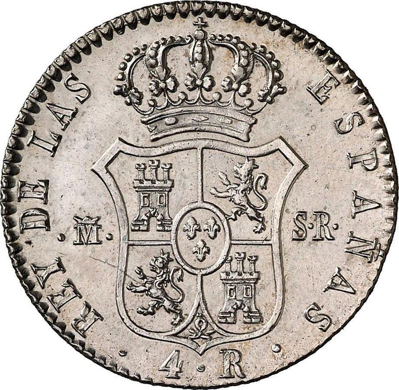 Find out the current coin value of the Spanish 4 Reales 1823 with mark M SR. This silver coin from the times of Ferdinand VII struck at the Madrid Mint. Wondering how much a coin like this is worth? The record price belongs to the lot 622 sold at the José A. Herrero, S.A. auction for EUR 375. Bidding took place May 8, 2013.