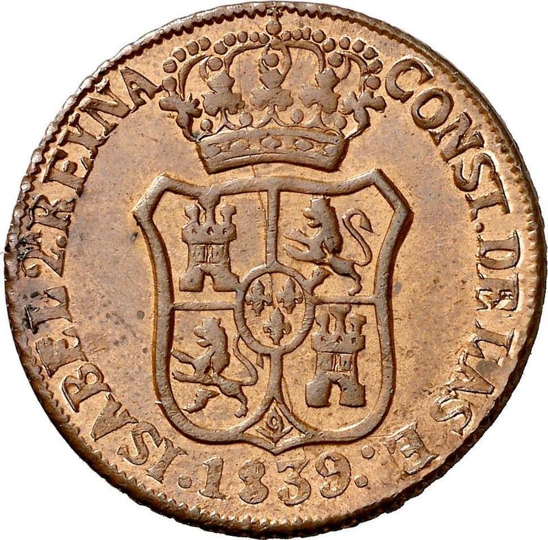 Find out the current coin value of the Spanish 3 Cuartos 1839 "Catalonia". This copper coin from the times of Isabella II struck at the Barcelona Mint. Wondering how much a coin like this is worth? The record price belongs to the lot 33550 sold at the Heritage Auctions auction for USD 376. Bidding took place April 14, 2016.