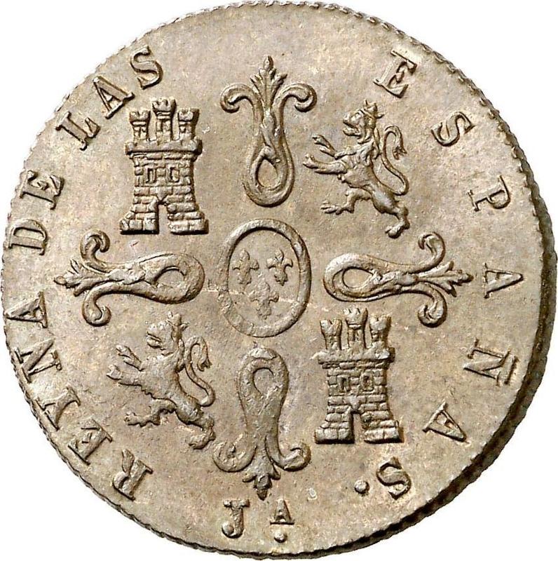 Find out the current coin value of the Spanish 4 Maravedís 1848 with mark Ja. This copper coin from the times of Isabella II struck at the Jubia Mint. Wondering how much a coin like this is worth? The record price belongs to the lot 35 sold at the Aureo & Calicó, S.L. auction for EUR 220. Bidding took place April 28, 2011.