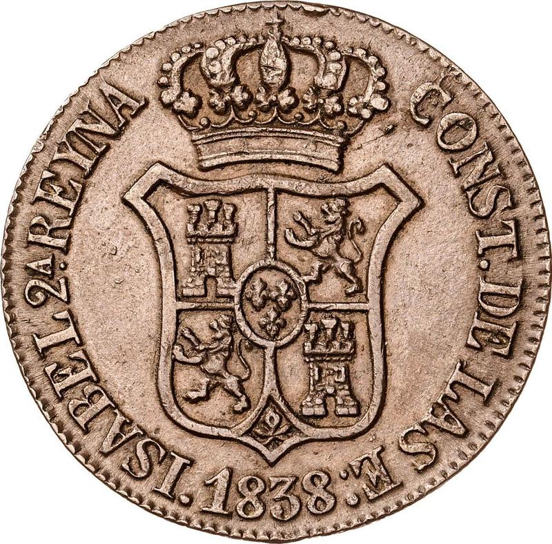 Find out the current coin value of the Spanish 6 Cuartos 1838 "Catalonia". This copper coin from the times of Isabella II struck at the Barcelona Mint. Wondering how much a coin like this is worth? The record price belongs to the lot 960 sold at the Aureo & Calicó, S.L. auction for EUR 650. Bidding took place October 29, 2015.
