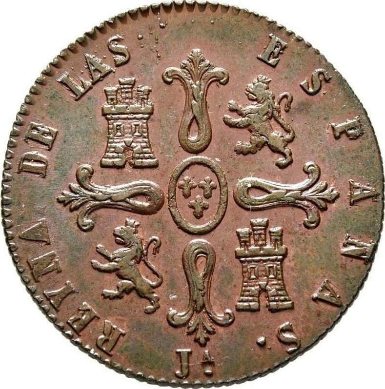Find out the current coin value of the Spanish 8 Maravedís 1839 "Denomination on obverse" with mark Ja. This copper coin from the times of Isabella II struck at the Jubia Mint. Wondering how much a coin like this is worth? The record price belongs to the lot 1573 sold at the Cayón Subastas auction for EUR 210. Bidding took place September 15, 2011.