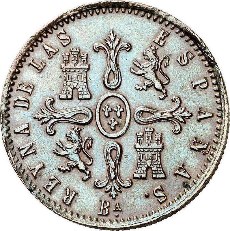 Find out the current coin value of the Spanish 8 Maravedís 1855 "Denomination on obverse" with mark Ba. Piedfort. This copper coin from the times of Isabella II struck at the Barcelona Mint. Wondering how much a coin like this is worth? The record price belongs to the lot 414 sold at the Aureo & Calicó, S.L. auction for EUR 240. Bidding took place March 12, 2020.