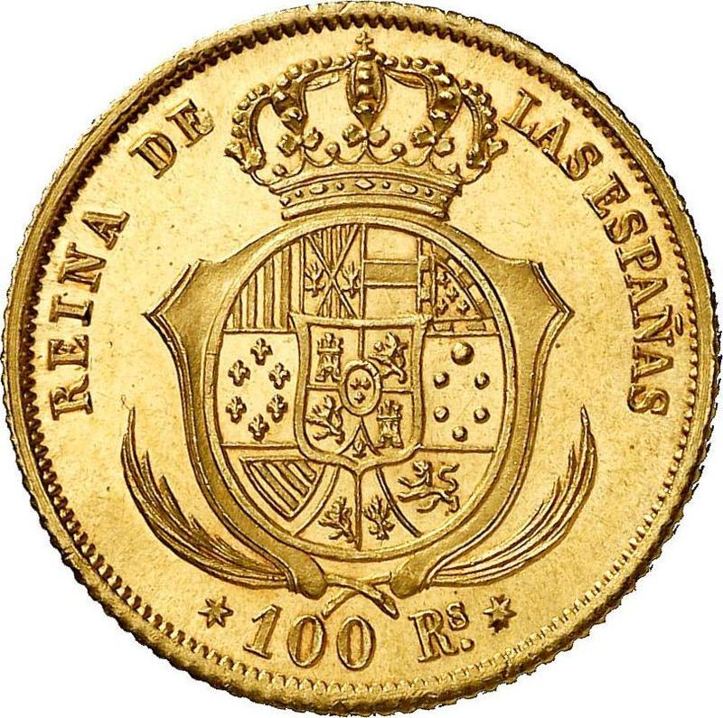 Find out the current coin value of the Spanish 100 Reales 1851 . 6-pointed star. This gold coin from the times of Isabella II struck at the Madrid Mint. Wondering how much a coin like this is worth? The record price belongs to the lot 611 sold at the Aureo & Calicó, S.L. auction for EUR 12,000. Bidding took place April 28, 2011.