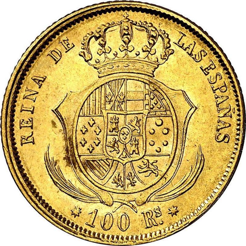 Find out the current coin value of the Spanish 100 Reales 1861 . 7-pointed star. This gold coin from the times of Isabella II struck at the Seville Mint. Wondering how much a coin like this is worth? The record price belongs to the lot 31331 sold at the Heritage Auctions auction for USD 2,880. Bidding took place May 1, 2025.