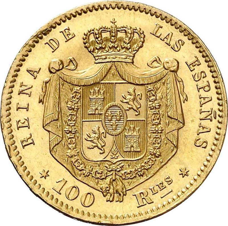 Find out the current coin value of the Spanish 100 Reales 1863 . 6-pointed star. This gold coin from the times of Isabella II struck at the Madrid Mint. Wondering how much a coin like this is worth? The record price belongs to the lot 35141 sold at the Heritage Auctions auction for USD 2,040. Bidding took place August 19, 2021.