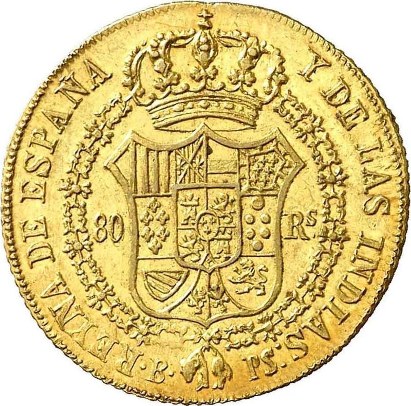 Find out the current coin value of the Spanish 80 Reales 1836 with mark B PS. This gold coin from the times of Isabella II struck at the Barcelona Mint. Wondering how much a coin like this is worth? The record price belongs to the lot 32837 sold at the Heritage Auctions auction for USD 4,812. Bidding took place May 6, 2021.