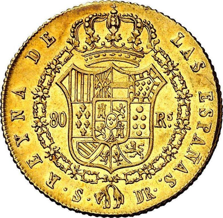 According to the latest data as of December 5, 2025 the average price of a Gold coin 80 Reales 1838 with mark S DR is 490 USD. The coin contains 5,9063 g of pure gold, so we do not recommend selling it for less than 809,13 USD, even if it is in poor condition and has no collectible value.