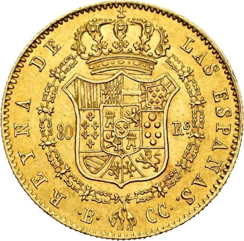 According to the latest data as of December 5, 2025 the average price of a Gold coin 80 Reales 1842 with mark B CC is 620 USD. The coin contains 5,9063 g of pure gold, so we do not recommend selling it for less than 809,13 USD, even if it is in poor condition and has no collectible value.