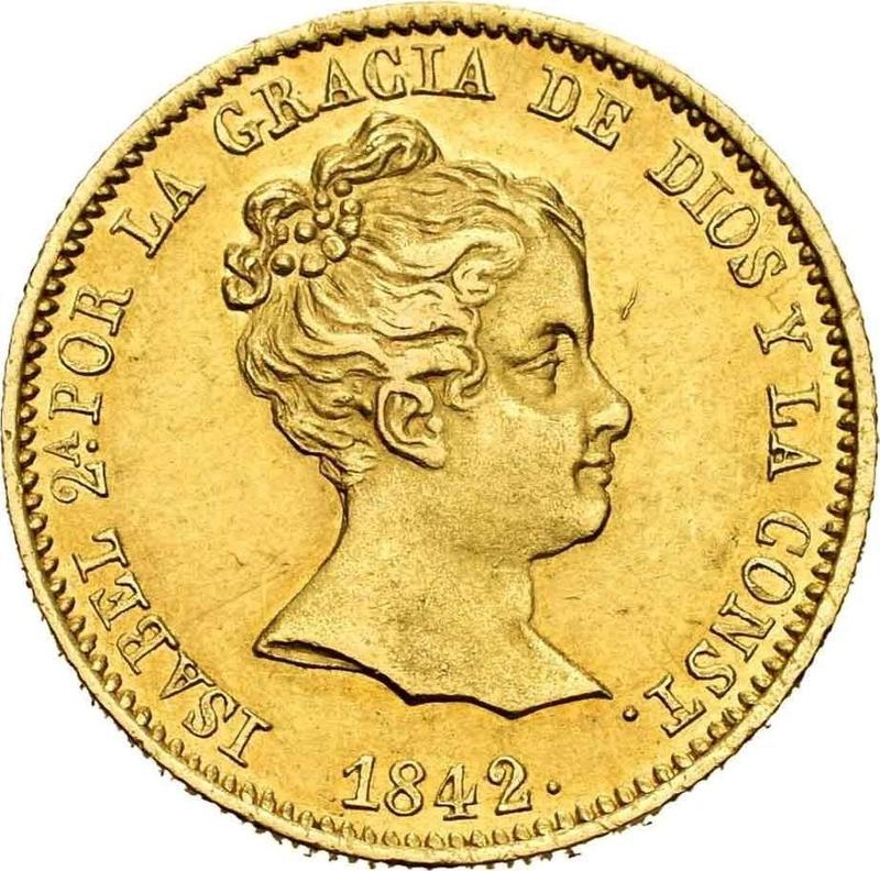 How much is the gold coin of Isabella II 80 Reales 1842 B CC?