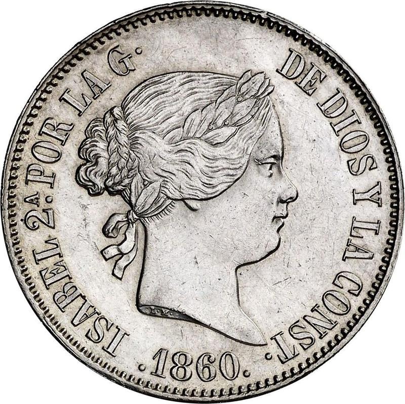 Find out the current coin value of the Spanish 10 Reales 1860 . 6-pointed star. This silver coin from the times of Isabella II struck at the Madrid Mint. Wondering how much a coin like this is worth? The record price belongs to the lot 1327 sold at the Numismatica Genevensis SA auction for CHF 850. Bidding took place November 25, 2025.