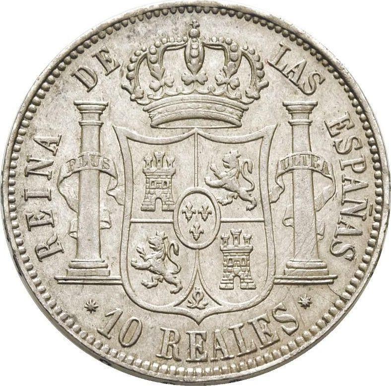 Find out the current coin value of the Spanish 10 Reales 1863 . 8-pointed star. This silver coin from the times of Isabella II struck at the Barcelona Mint. Wondering how much a coin like this is worth? The record price belongs to the lot 426 sold at the Aureo & Calicó, S.L. auction for EUR 1,400. Bidding took place April 28, 2011.