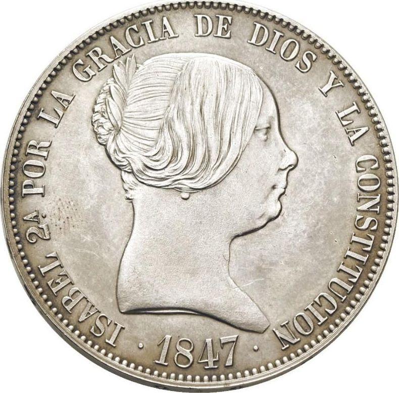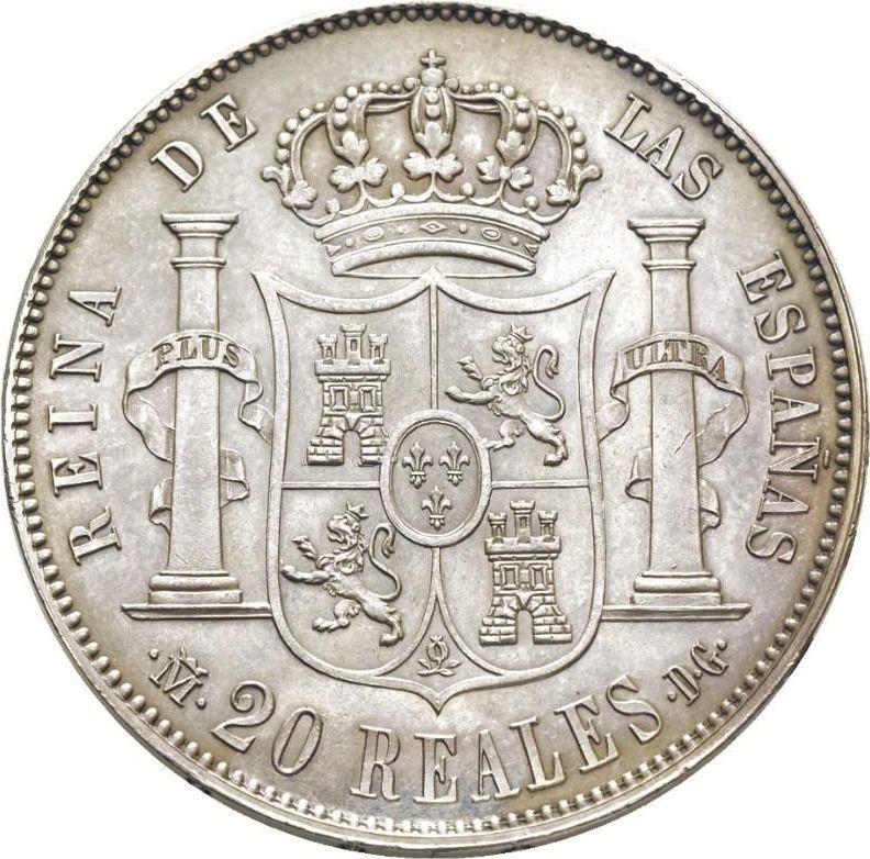 Find out the current coin value of the Spanish 20 Reales 1847 with mark M DG. This silver coin from the times of Isabella II struck at the Madrid Mint. Wondering how much a coin like this is worth? The record price belongs to the lot 432 sold at the Aureo & Calicó, S.L. auction for EUR 34,000. Bidding took place March 12, 2020.