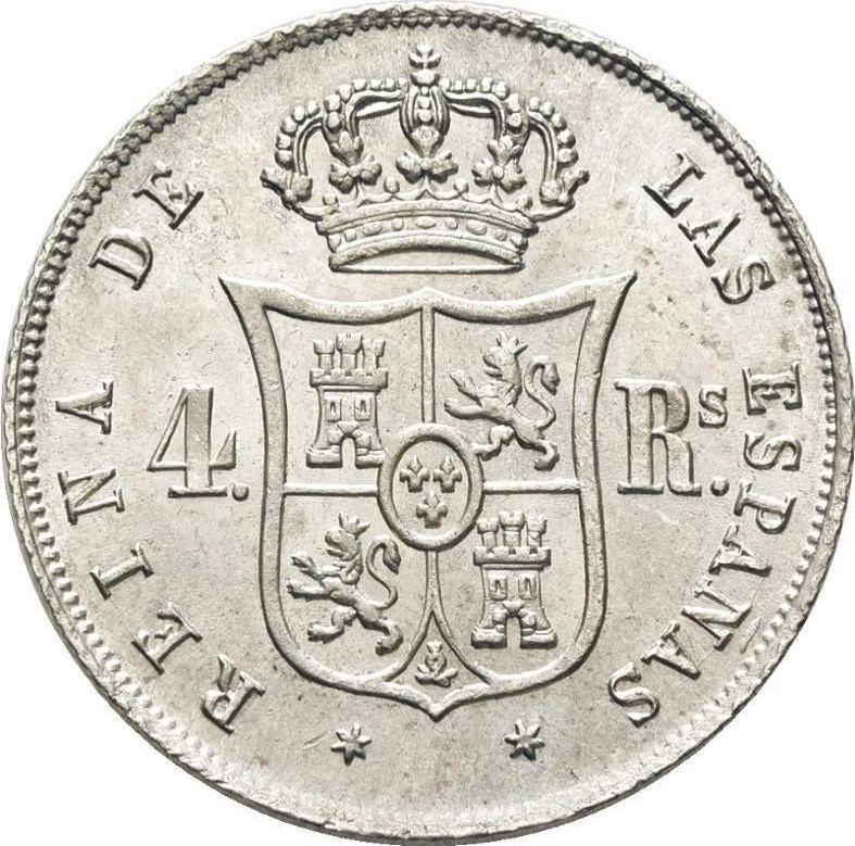 Find out the current coin value of the Spanish 4 Reales 1854 . 6-pointed star. This silver coin from the times of Isabella II struck at the Madrid Mint. Wondering how much a coin like this is worth? The record price belongs to the lot 1128 sold at the Aureo & Calicó, S.L. auction for EUR 400. Bidding took place October 29, 2015.
