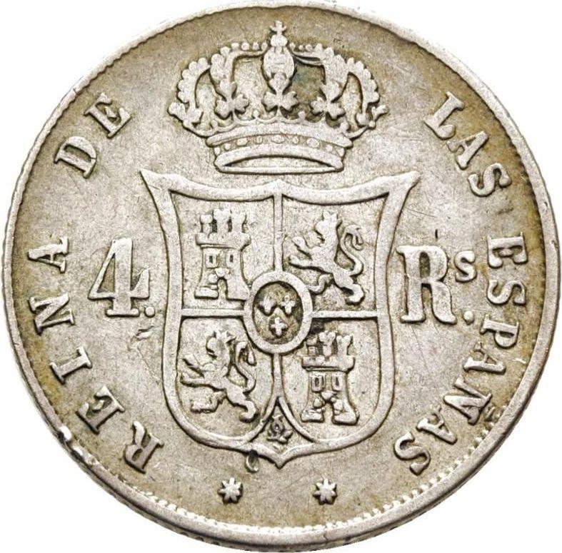 Find out the current coin value of the Spanish 4 Reales 1857 . 7-pointed star. This silver coin from the times of Isabella II struck at the Seville Mint. Wondering how much a coin like this is worth? The record price belongs to the lot 398 sold at the Aureo & Calicó, S.L. auction for EUR 300. Bidding took place May 30, 2024.