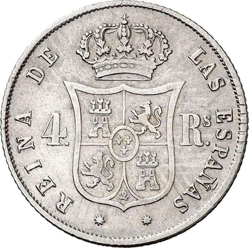 Find out the current coin value of the Spanish 4 Reales 1861 . 8-pointed star. This silver coin from the times of Isabella II struck at the Barcelona Mint. Wondering how much a coin like this is worth? The record price belongs to the lot 908 sold at the José A. Herrero, S.A. auction for EUR 325. Bidding took place December 12, 2013.