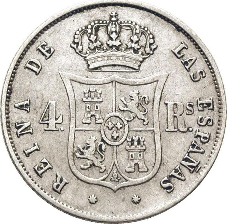 Find out the current coin value of the Spanish 4 Reales 1862 . 8-pointed star. This silver coin from the times of Isabella II struck at the Barcelona Mint. Wondering how much a coin like this is worth? The record price belongs to the lot 721 sold at the Aureo & Calicó, S.L. auction for EUR 120. Bidding took place May 30, 2012.