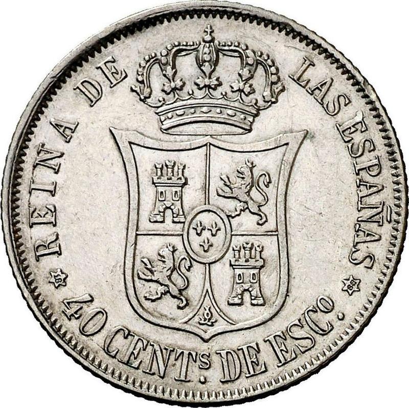 Find out the current coin value of the Spanish 40 Céntimos de escudo 1868 . 6-pointed star. This silver coin from the times of Isabella II struck at the Madrid Mint. Wondering how much a coin like this is worth? The record price belongs to the lot 34122 sold at the Heritage Auctions auction for USD 780. Bidding took place September 7, 2017.