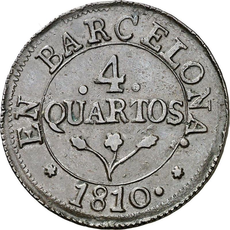 Find out the current coin value of the Spanish 4 Cuartos 1810 . This copper coin from the times of Joseph Bonaparte struck at the Barcelona Mint. Wondering how much a coin like this is worth? The record price belongs to the lot 199 sold at the Aureo & Calicó, S.L. auction for EUR 220. Bidding took place December 17, 2020.
