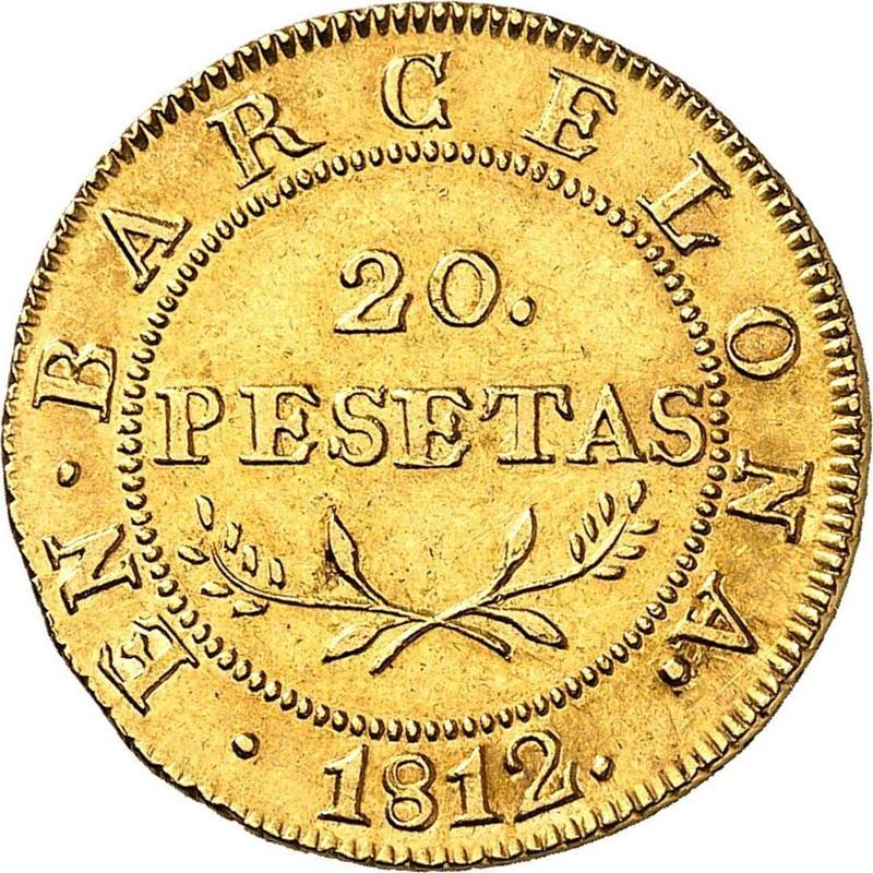 Find out the current coin value of the Spanish 20 Pesetas 1812 . This gold coin from the times of Joseph Bonaparte struck at the Barcelona Mint. Wondering how much a coin like this is worth? The record price belongs to the lot 21894 sold at the Heritage Auctions auction for USD 4,313. Bidding took place August 12, 2010.