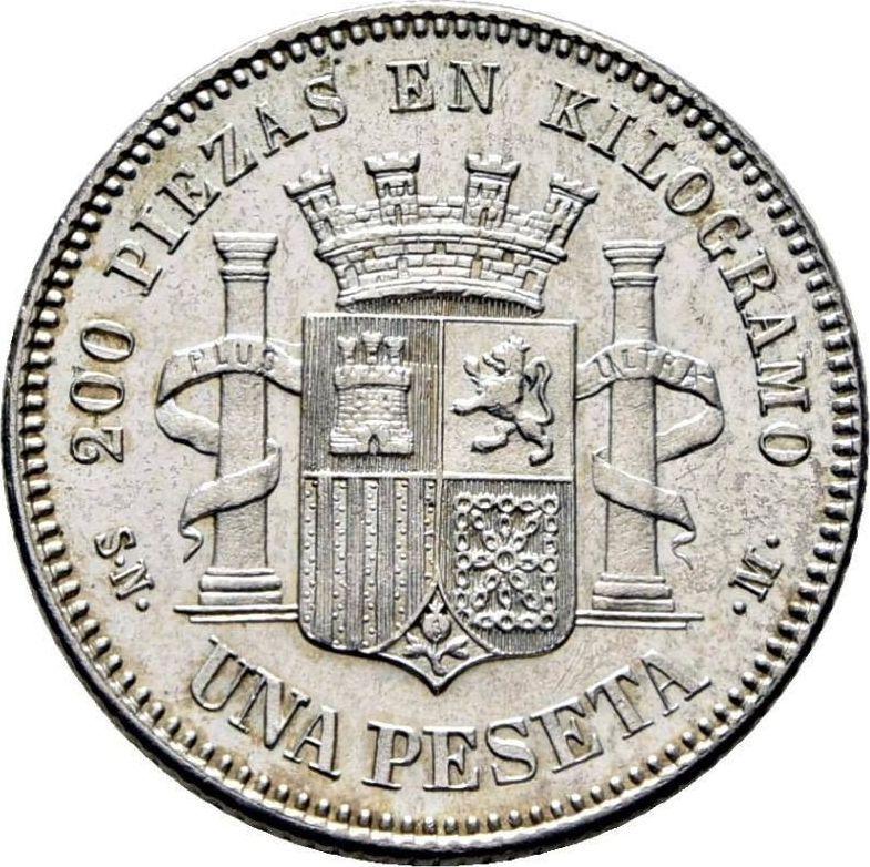 Find out the current coin value of the Spanish 1 Peseta 1870 with mark SNM. This silver coin from the times of Provisional Government struck at the Madrid Mint. Wondering how much a coin like this is worth? The record price belongs to the lot 433 sold at the Aureo & Calicó, S.L. auction for EUR 1,600. Bidding took place March 10, 2016.