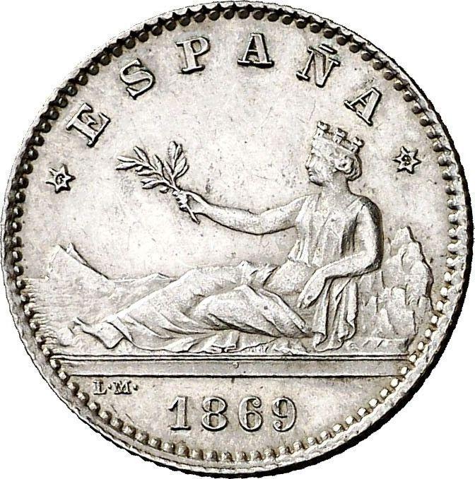 Find out the current coin value of the Spanish 50 Céntimos 1869 with mark SNM. This silver coin from the times of Provisional Government struck at the Madrid Mint. Wondering how much a coin like this is worth? The record price belongs to the lot 25750 sold at the Heritage Auctions auction for USD 11,500. Bidding took place September 7, 2011.
