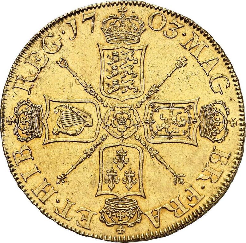 Find out the current coin value of the British Five guineas 1703 "Pre-Union". VIGO. This gold coin from the times of Anne. Wondering how much a coin like this is worth? The record price belongs to the lot 69 sold at the Baldwin's of St. James's auction for USD 900,000. Bidding took place January 13, 2019.