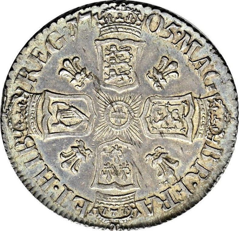 Sixpence 1705. Old type of shields. Plumes in angles (United Kingdom, Anne)