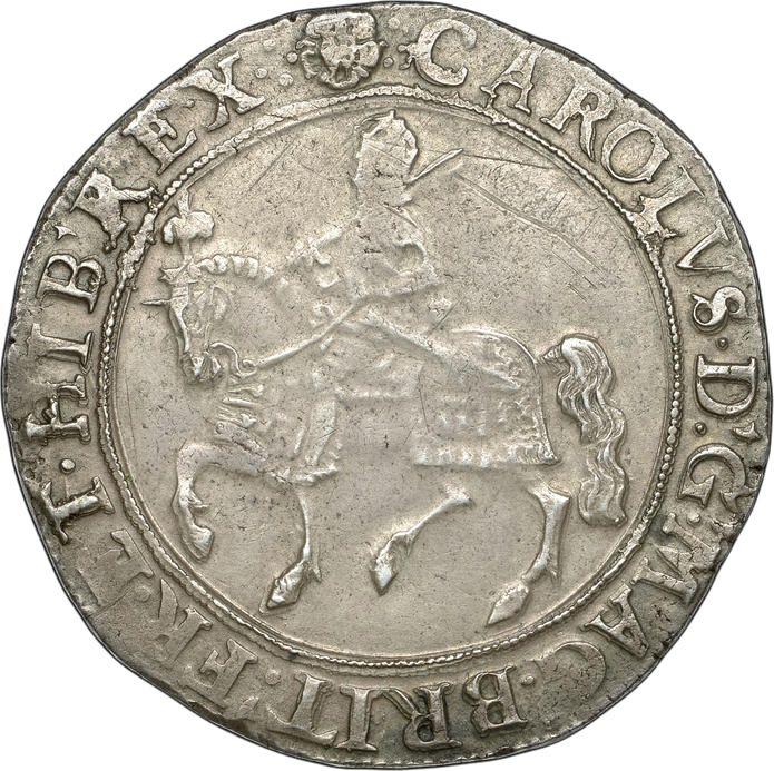 Halfcrown no date (1625-1642) "Second type of horseman". "CR" above the shield. Plume above the shield (United Kingdom, Charles I)