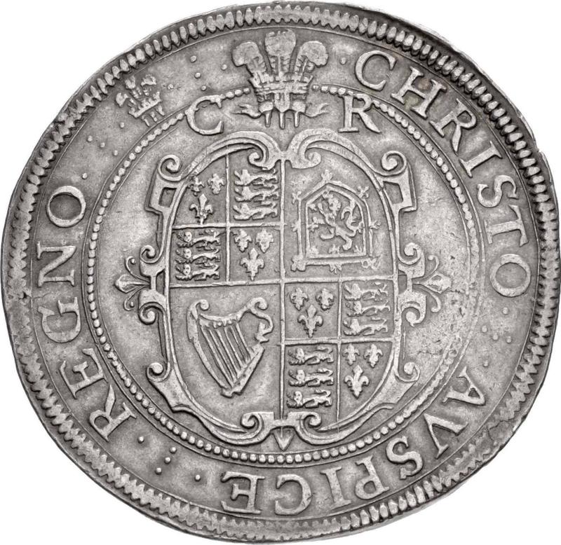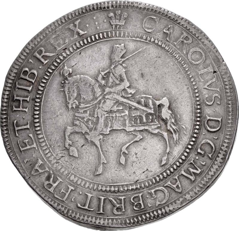 Crown no date (1625-1649) "Second type of horseman". Plume above the shield (United Kingdom, Charles I)
