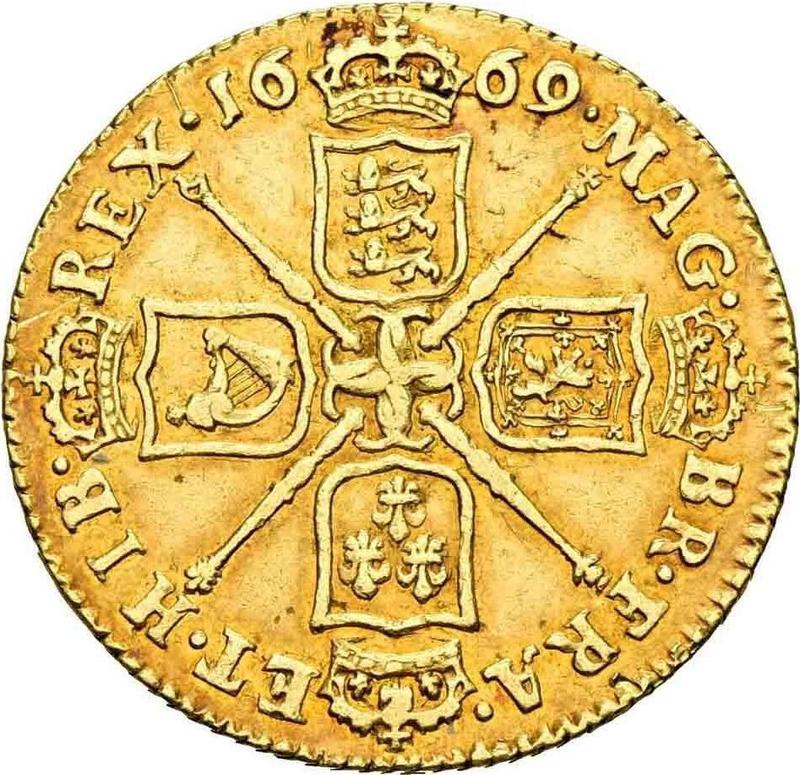 How much is the gold coin of Charles II Guinea 1669 "Third laureate bust"?