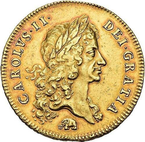 Find out the current coin value of the British Five guineas 1669 "First laureated bust". Elephant. This gold coin from the times of Charles II. Wondering how much a coin like this is worth? The record price belongs to the lot 131 sold at the SINCONA AG auction for CHF 70,000. Bidding took place May 16, 2022.