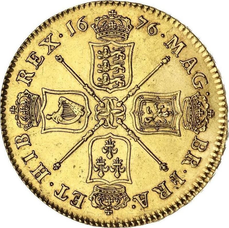 Five guineas 1676 "First laureated bust". Elephant and castle (United Kingdom, Charles II)