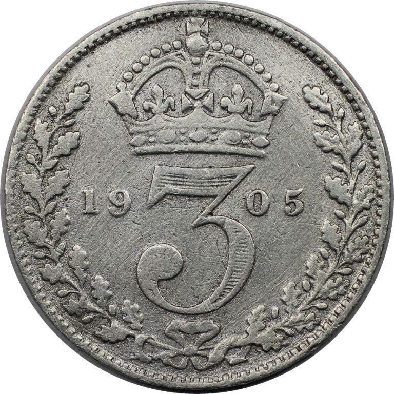 Find out the current coin value of the British Threepence 1905 . This silver coin from the times of Edward VII. Wondering how much a coin like this is worth? The record price belongs to the lot 83 sold at the Baldwin's of St. James's auction for GBP 160. Bidding took place March 20, 2019.