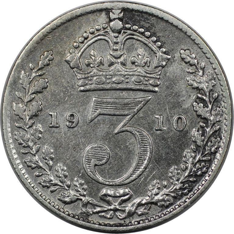 Find out the current coin value of the British Threepence 1910 . This silver coin from the times of Edward VII. Wondering how much a coin like this is worth? The record price belongs to the lot 88 sold at the Baldwin's of St. James's auction for GBP 200. Bidding took place March 20, 2019.