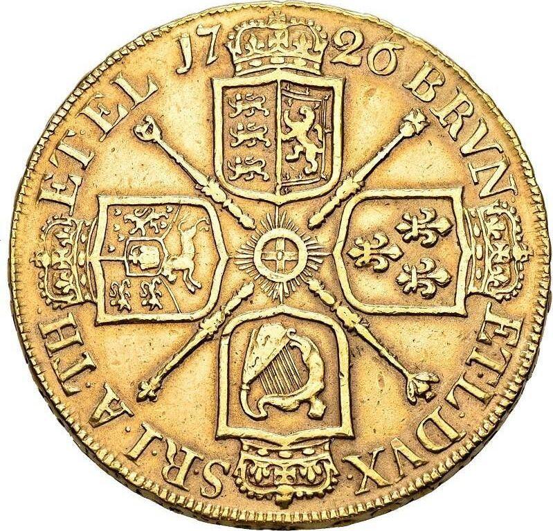 Find out the current coin value of the British Five guineas 1726 . This gold coin from the times of George I. Wondering how much a coin like this is worth? The record price belongs to the lot 30311 sold at the Heritage Auctions auction for USD 90,000. Bidding took place March 25, 2021.