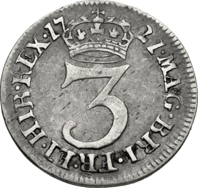 Find out the current coin value of the British Threepence 1721 . This silver coin from the times of George I. Wondering how much a coin like this is worth? The record price belongs to the lot 637 sold at the Classical Numismatic Group, LLC auction for USD 130. Bidding took place September 1, 2021.