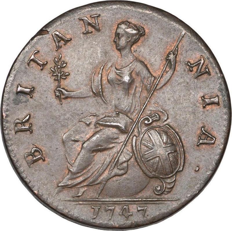 The information on the current value of the British coin Halfpenny 1747 "Old Head" is based on actual auction sales of similar specimens. To reflect the current price level, our service monitors over 590 numismatic companies and records auction results in the coin catalog and auction archive. Please note that the exact value depends directly on the coin's condition, so the average price serves only as an approximate estimate.