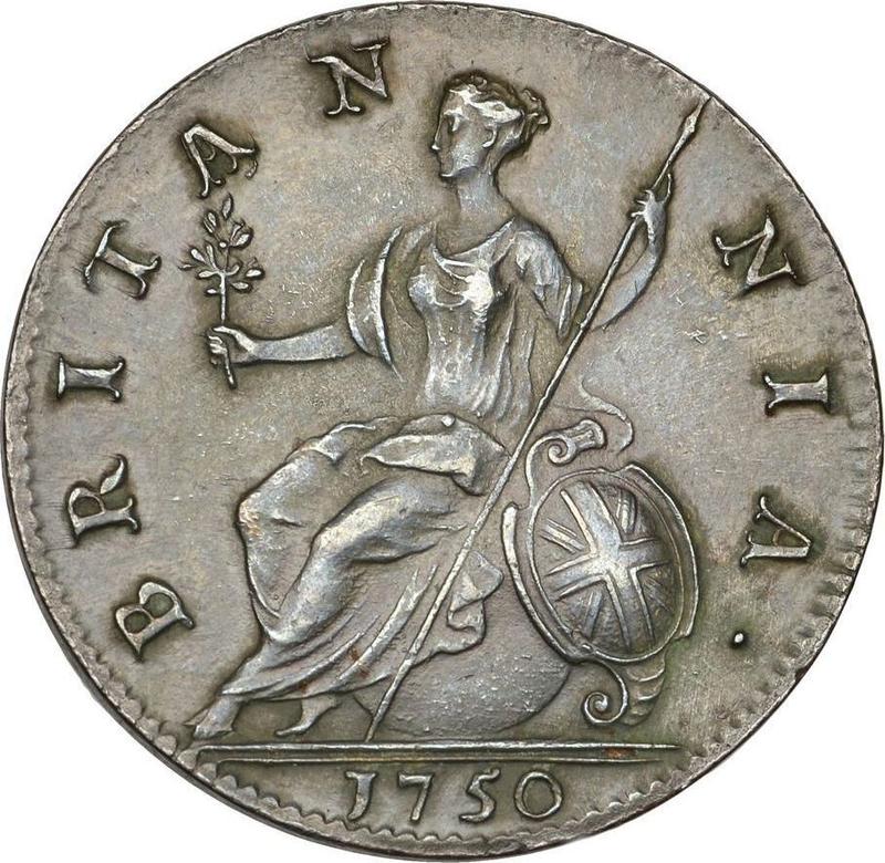 Find out the current coin value of the British Halfpenny 1750 "Old Head". This copper coin from the times of George II. Wondering how much a coin like this is worth? The record price belongs to the lot 34796 sold at the Heritage Auctions auction for USD 1,140. Bidding took place January 16, 2018.