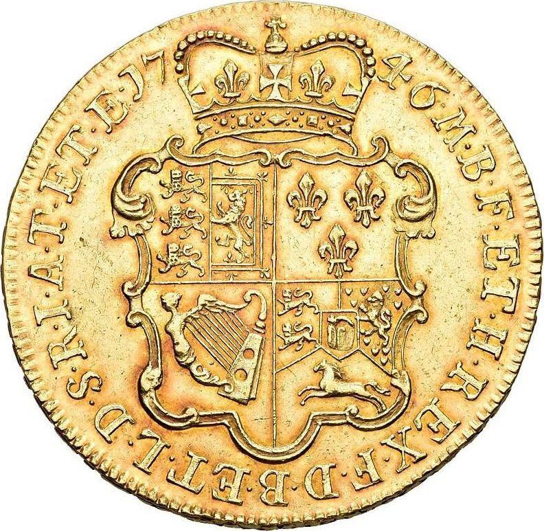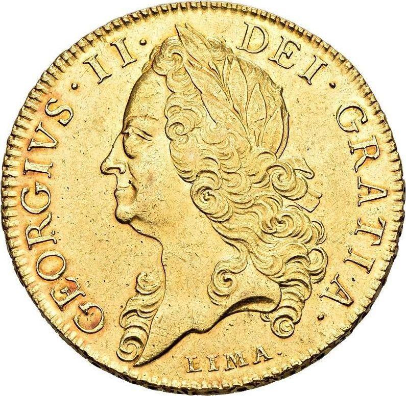 Find out the current coin value of the British Five guineas 1746 "Old Head" with mark LIMA. This gold coin from the times of George II. Wondering how much a coin like this is worth? The record price belongs to the lot 1173 sold at the SINCONA AG auction for CHF 140,000. Bidding took place May 17, 2022.