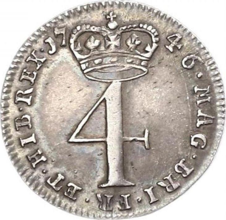 Find out the current coin value of the British Fourpence (Groat) 1746 . This silver coin from the times of George II. Wondering how much a coin like this is worth? The record price belongs to the lot 1984 sold at the London Coins LTD auction for GBP 200. Bidding took place December 2, 2023.