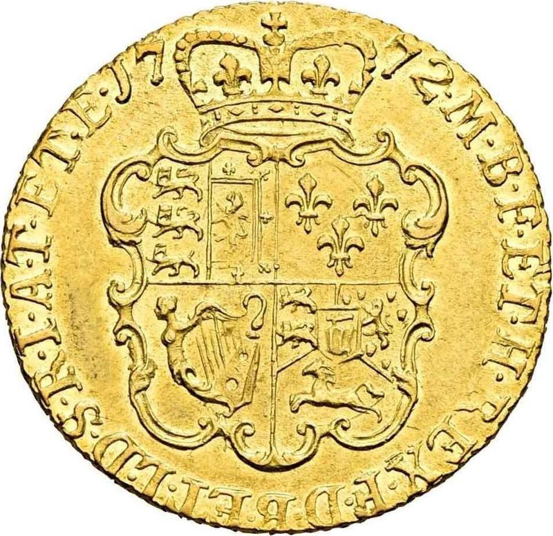According to the latest data as of December 5, 2025 the average price of a Gold coin Guinea 1772 "Third laureate bust" is 2400 USD. The coin contains 7,6845 g of pure gold, so we do not recommend selling it for less than 1045,31 USD, even if it is in poor condition and has no collectible value.